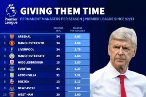 体育资讯10月22日讯 《转会市场》统计了英超各队的历任正式主教练平均执教年限情况,阿森纳无悬念居首。